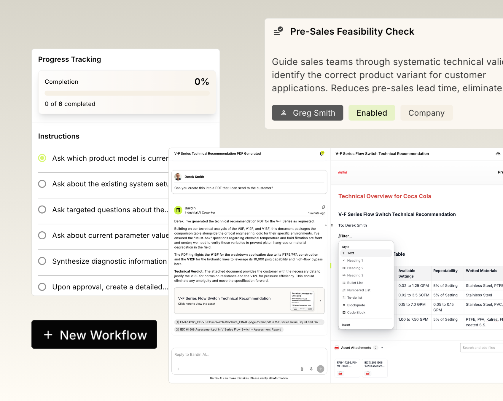 Your customers don’t buy from a catalog. They have constraints like environment, legacy systems, regulations, and physics that require real engineering judgment. Bardin gives every person on your team access to that judgment, instantly.
